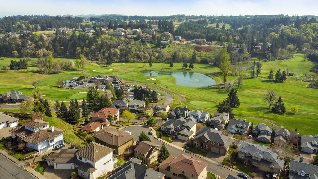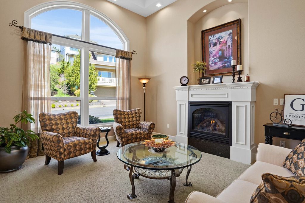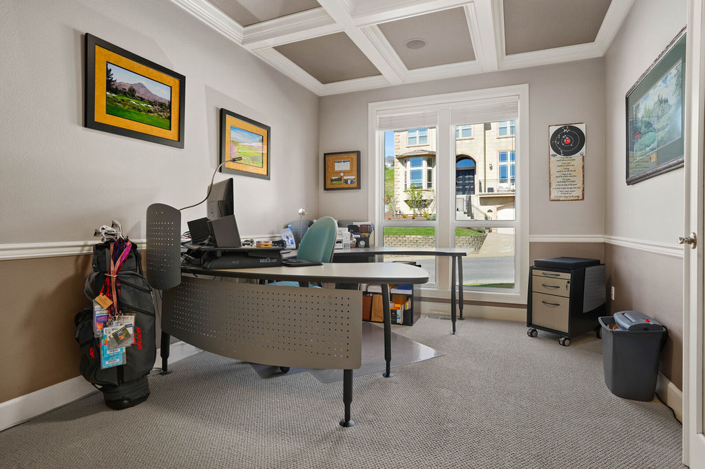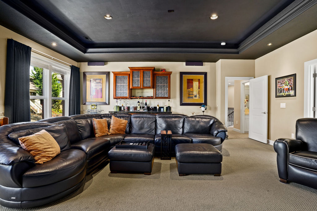 Upstairs bonus room includes an attached full bathroom and a wet bar with mini fridge and cove lighting. Double doors take you into the primary bedroom and ensuite with double sinks, soaking tub, and walk-in closet. Additional features of the home include laundry with storage and utility sink, three car garage, and two furnaces with separate controlled zoning. Head out side and sit on your patio which overlooks beautiful landscaping and several holes.