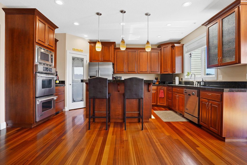 Immaculate home with incredible views of Creekside Golf Course welcomes you with a gorgeous exterior and grand entrance. As a Tour Home in 2003 there are many custom features, including cherry hardwood floors and gas fireplaces in both the living and family rooms. An office on main level features large windows and glass French doors allowing for great natural light. The kitchen has a walk-in pantry, double ovens, island, and granite countertops.